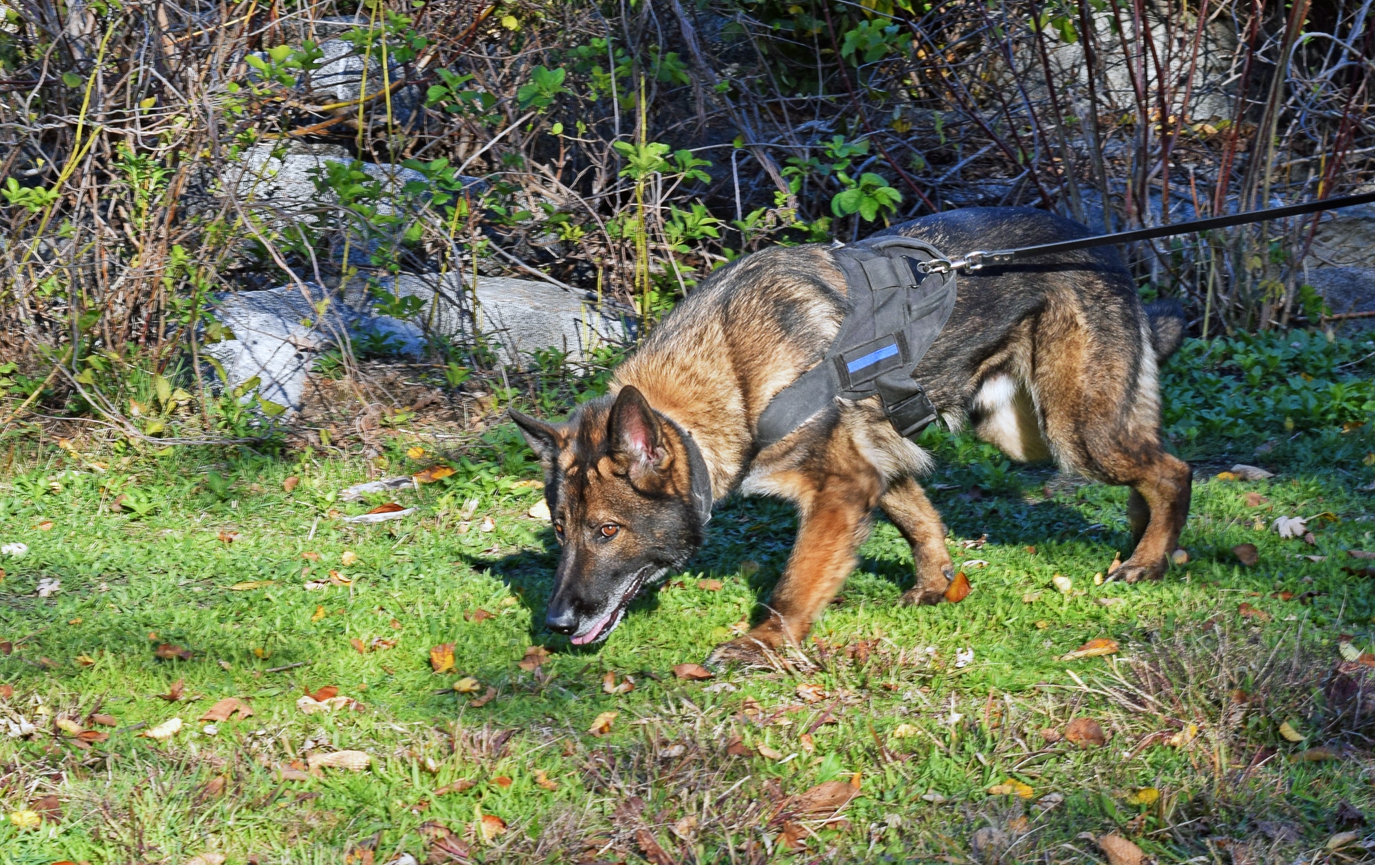 K9 Bossi is a “dual purpose” dog. He is certified in both patrol and narcotics detection. Patrol consists of tracking, area search, article search (evidence), building searches, criminal apprehension, obedience and agility.