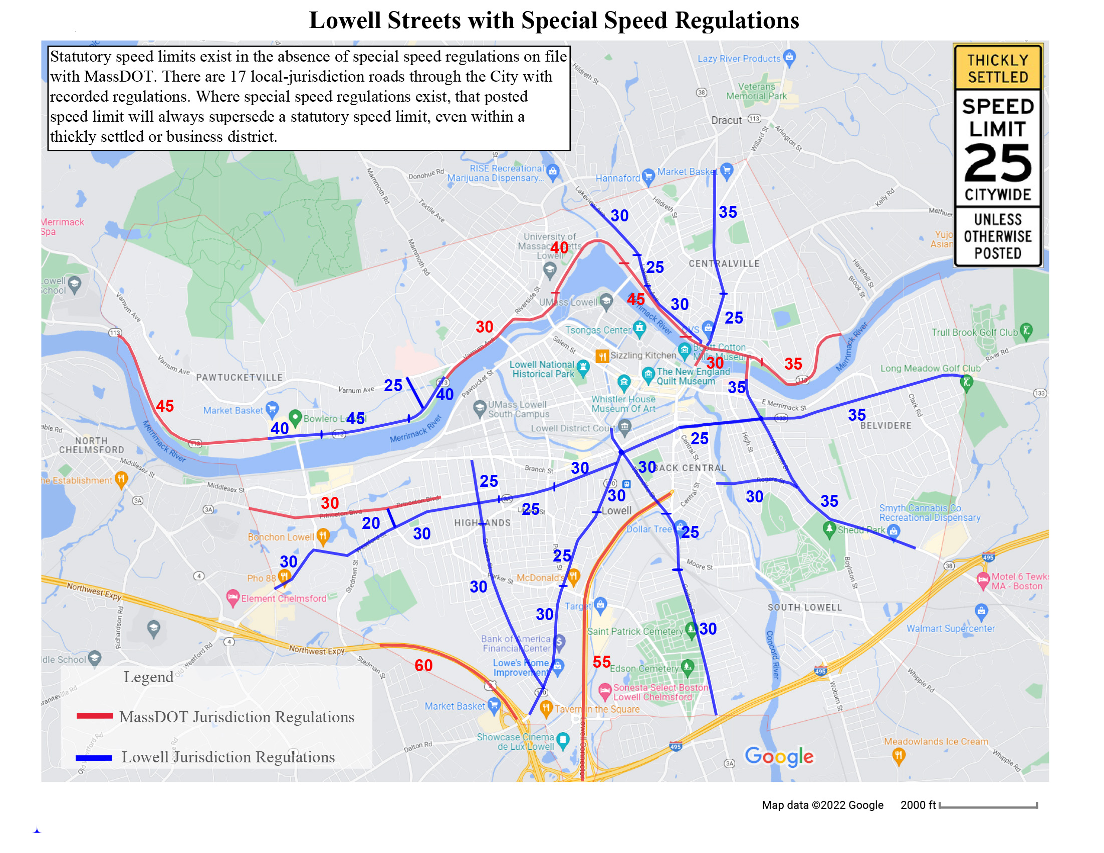 The City of Lowell will be installing new signs at the City’s borders and other key locations advising motorists of the new speed restriction. The Lowell Police Department intends to conduct an extensive public information campaign as the new measure takes effect to ensure motorists are aware of the change before strict enforcement of the reduced speed limit takes place.