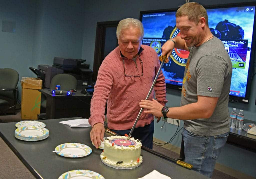 Following the unveiling, the Lowell Police Department’s contingent of about 20 U.S. Marines celebrated the Marine Corps’ 247th birthday in a small ceremony organized by Officer Kevin Gillan at the police station. The youngest Marine, Lowell General Hospital EMT Robert Rival, cut a birthday cake with a Marine Corps sabre and served the first slice of cake to the oldest Marine, retired Officer Robert Sturtevant. Rival deployed to Afghanistan with Lowell Police Officer Paul Robbins in 2011.