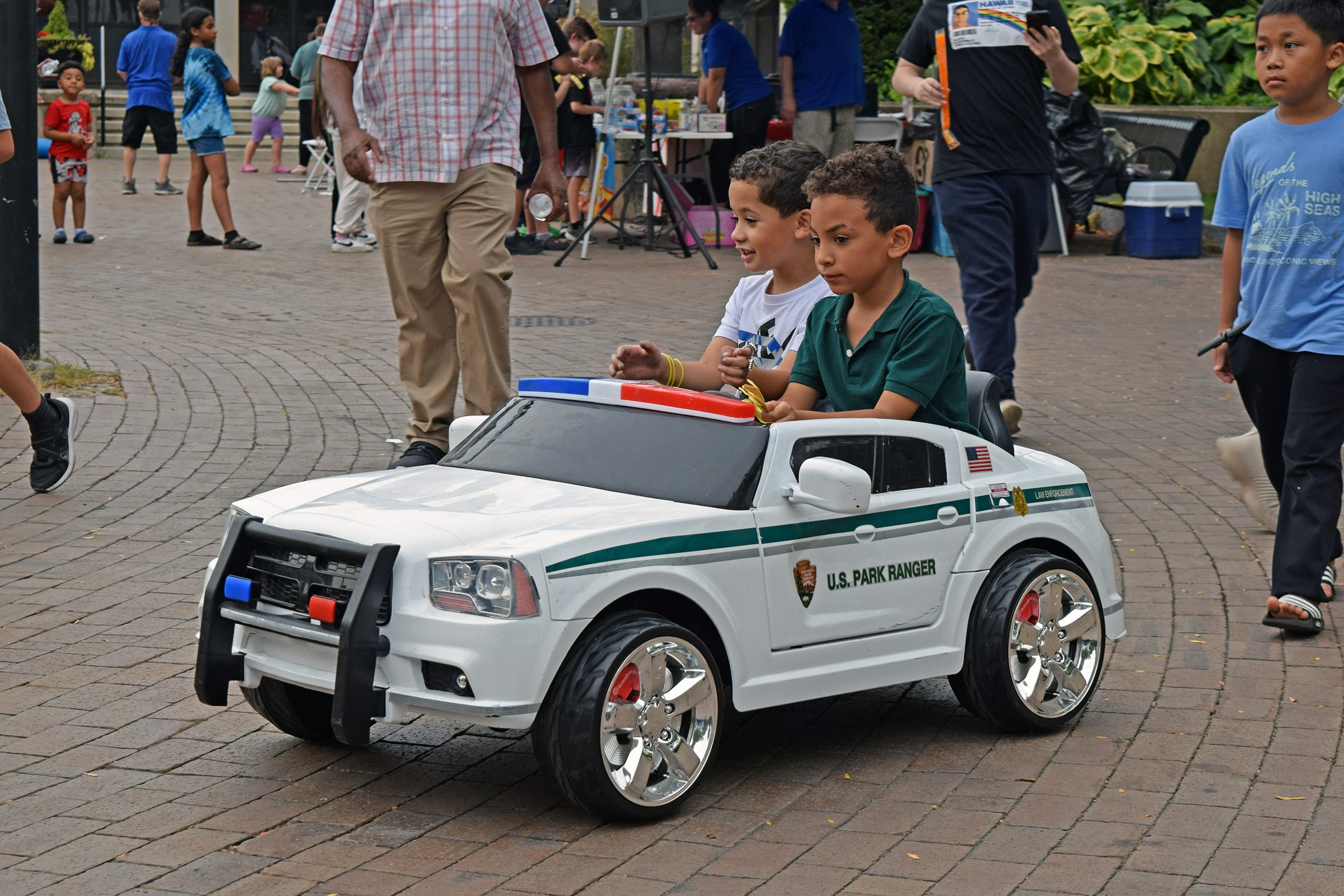 Two boys ride in a U.S. Park Service Police toy car at Youth Outreach Day. (Courtesy Lowell Police Department)