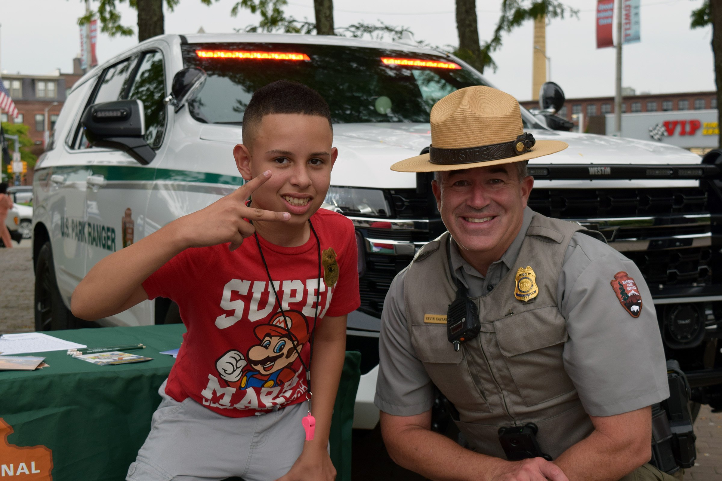 Kevin Kavanagh of the National Park Police poses with a boy at Youth Outreach Day. National Park Police were just one of several agencies that sent police cruisers and officers to interact with Lowell youth. (Courtesy Lowell Police Department)