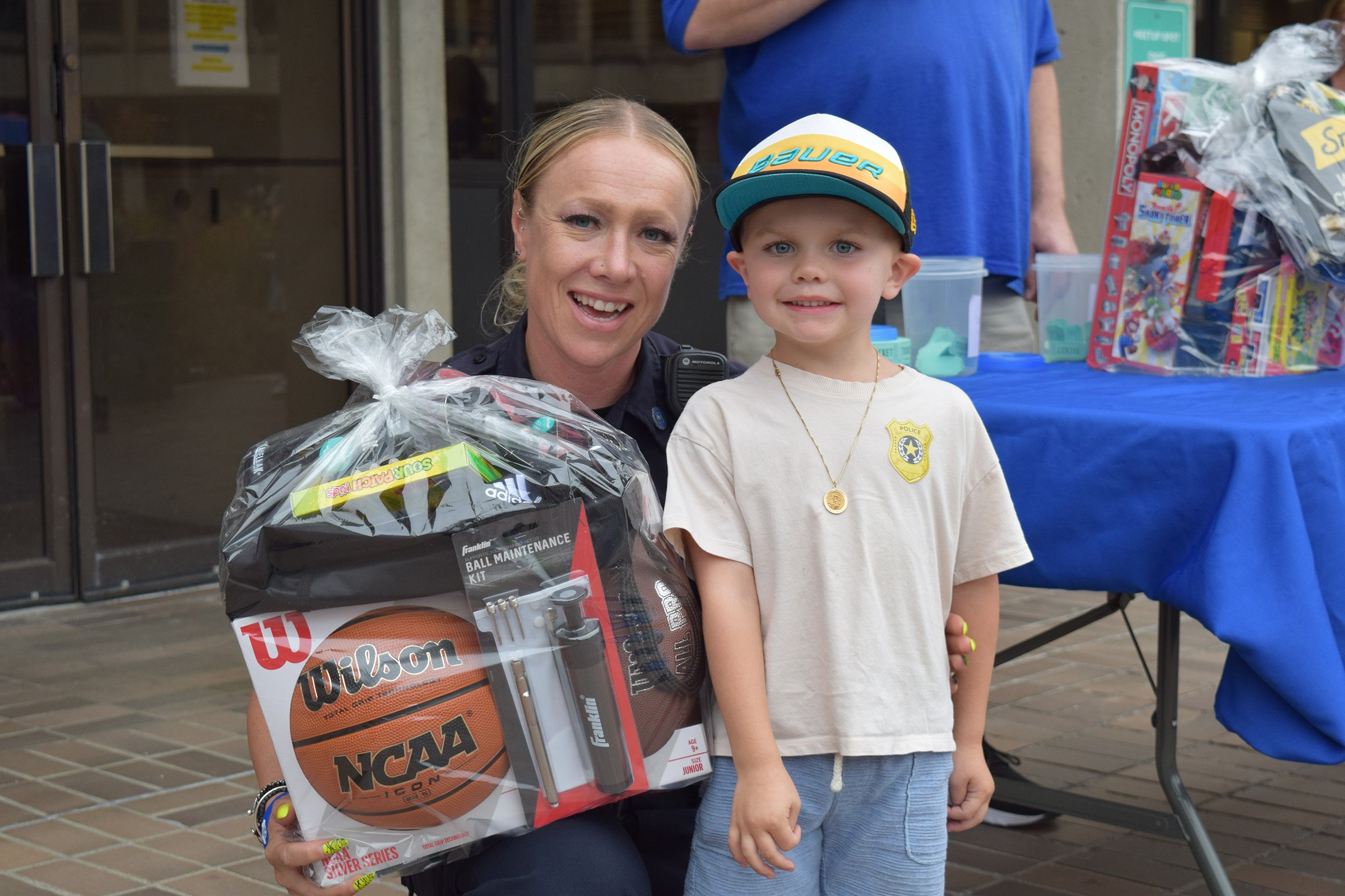Lowell Police School Resource Officer Mindy Dower poses with a boy who won one of the raffle baskets donated by the Lowell Police Patrol Officer’s Union and the Lowell Police Superior Officer’s Union. (Courtesy Lowell Police Department)