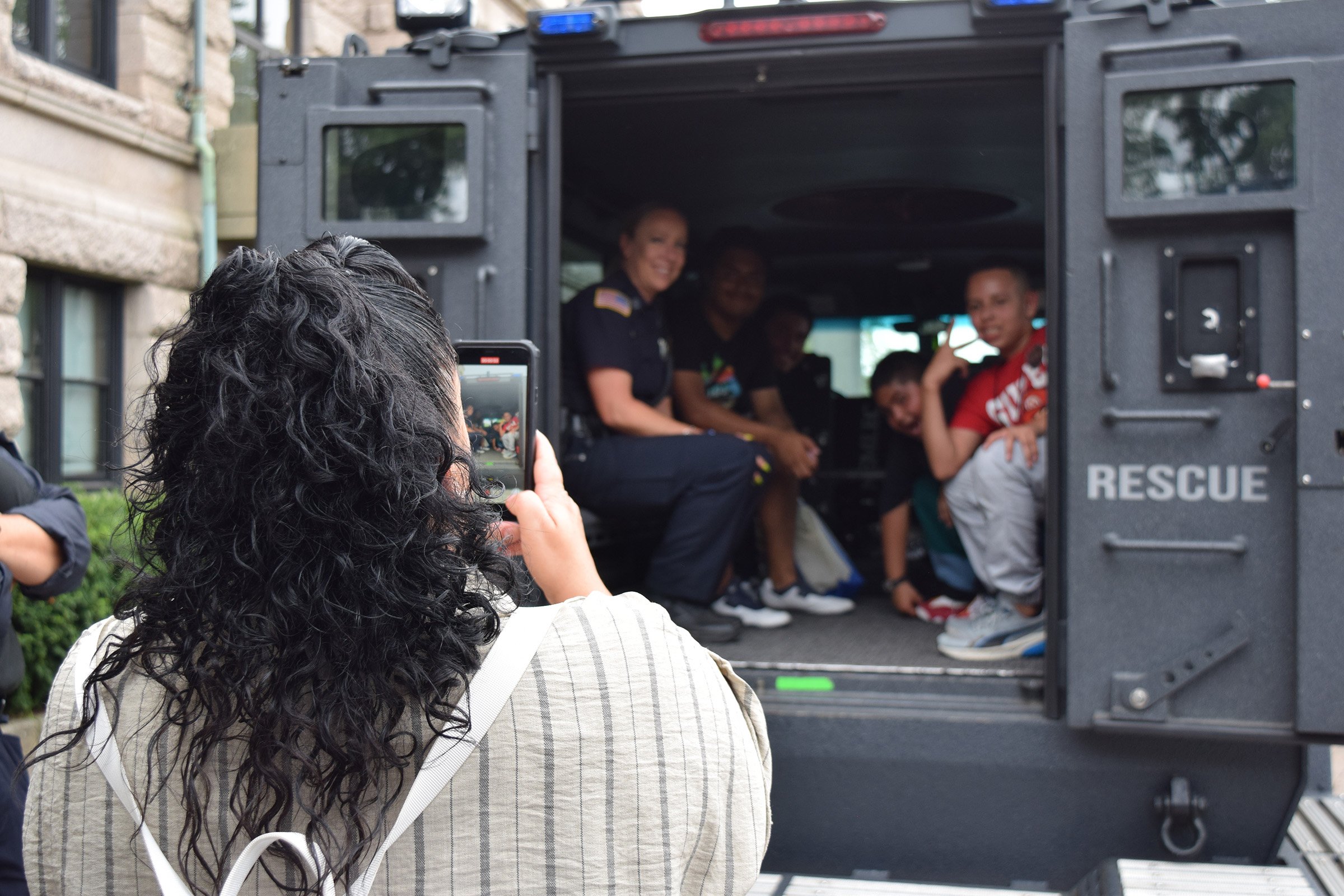 Lowell Police School Resource Officer Mindy Dower poses with youth in a rescue vehicle brought to Youth Outreach Day by the Northeastern Massachusetts Law Enforcement Council. (Courtesy Lowell Police Department)