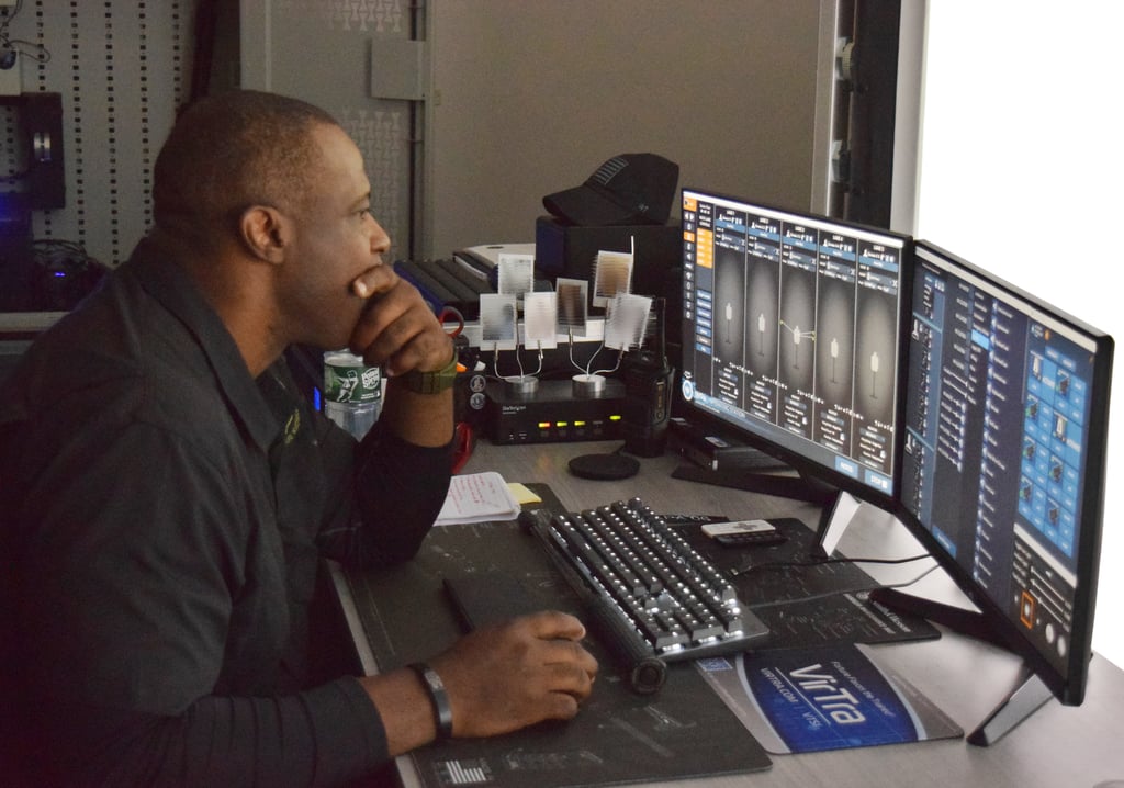 The V-300 simulator includes five large screens that provide a 300-degree immersive training environment. The V-300 recreates physiological stressors such as an elevated heart rate and high levels of adrenaline that officers experience during an intense incident.
